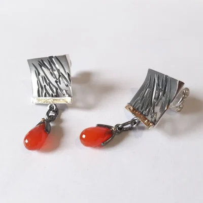 Los pendientes hechos a mano de Elisenda de Haro están fabricados principalmente en plata, haciendo uso de diferentes elementos como detalles en oro, piedras preciosas y óxidos de diferentes colores.